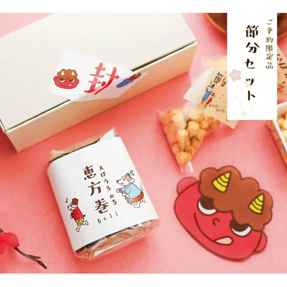 可愛いラッピングで届く節分セット。恵方巻のお味はお好みでオーダー。